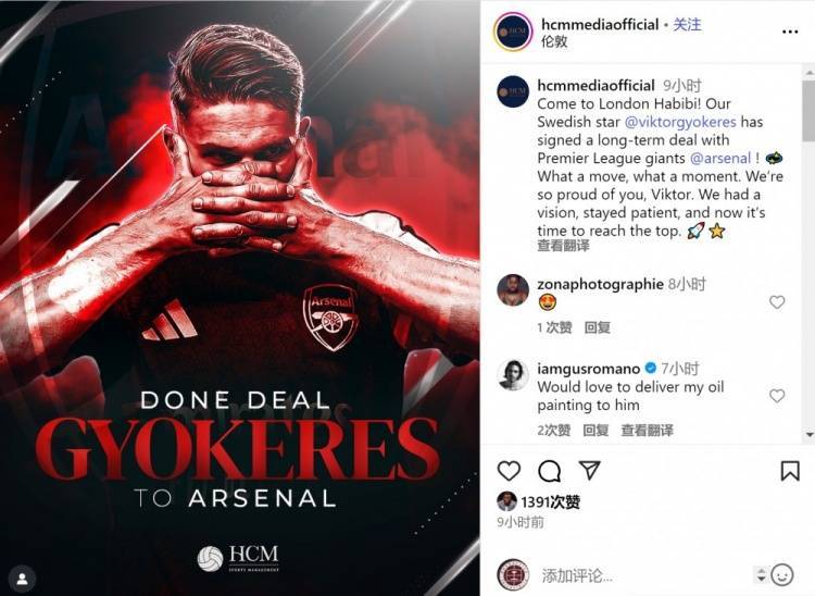 直播吧7月27日讯 葡萄牙体育中锋约克雷斯转会阿森纳,球员经纪公司HCM Sports Management社媒发文表示祝贺。